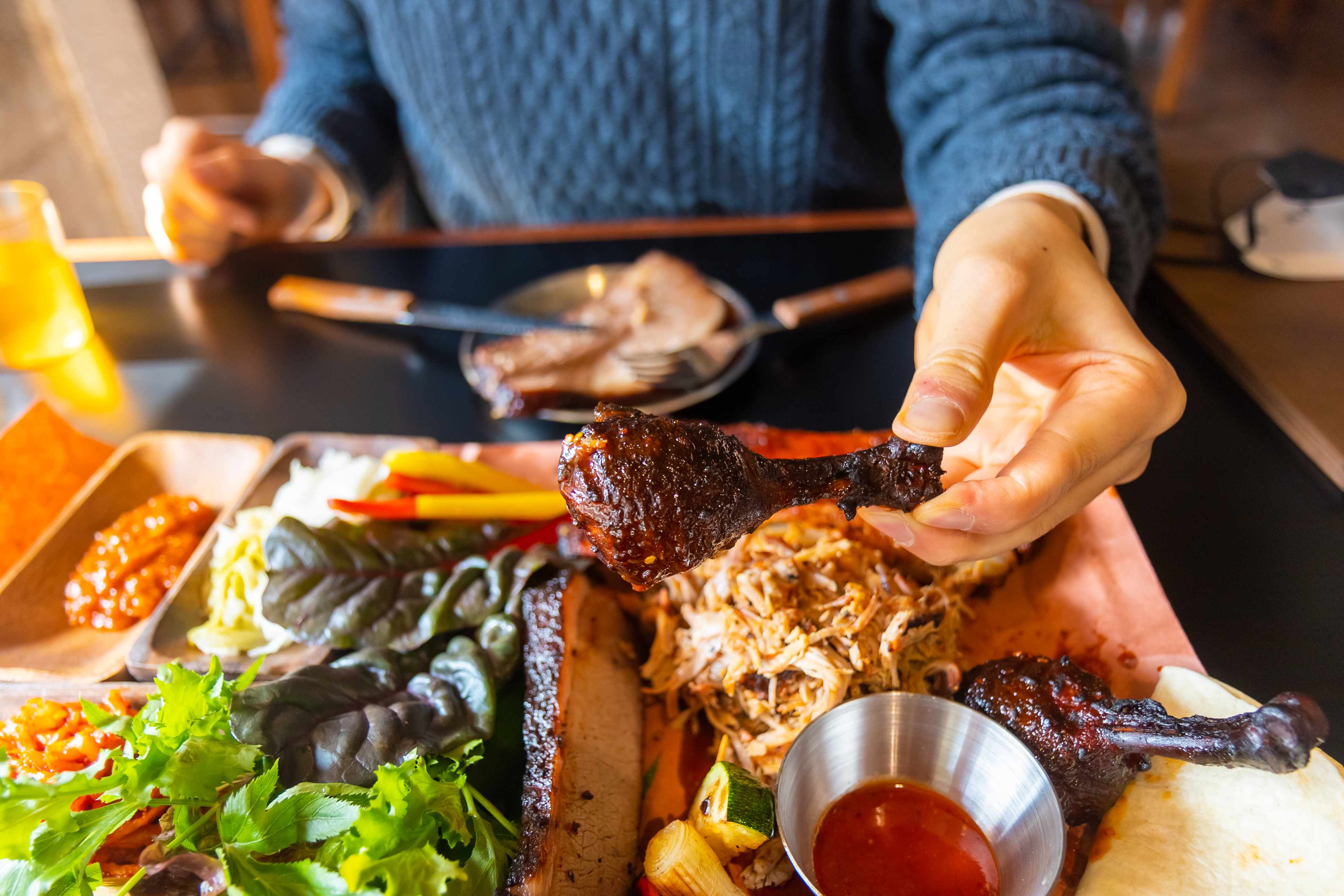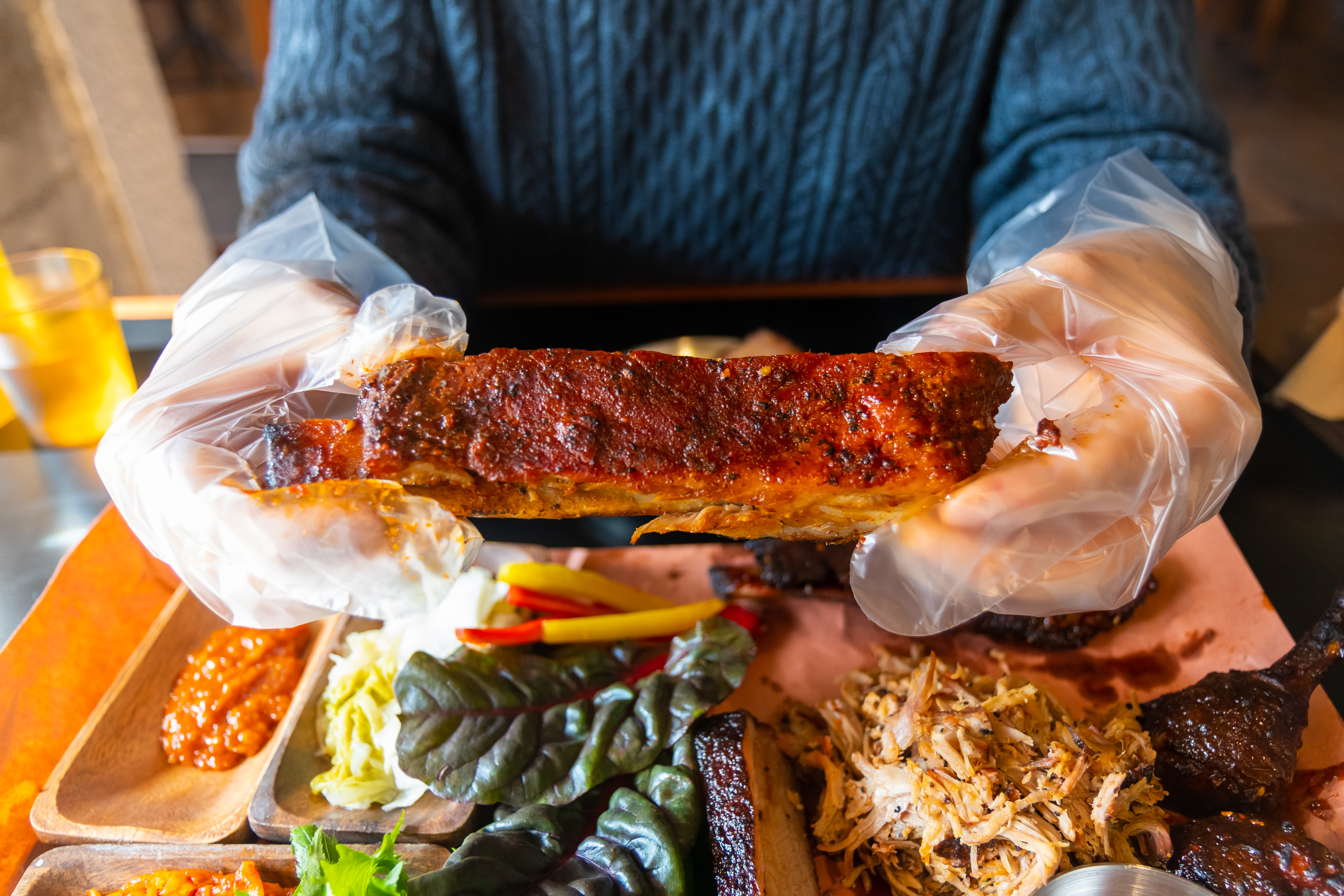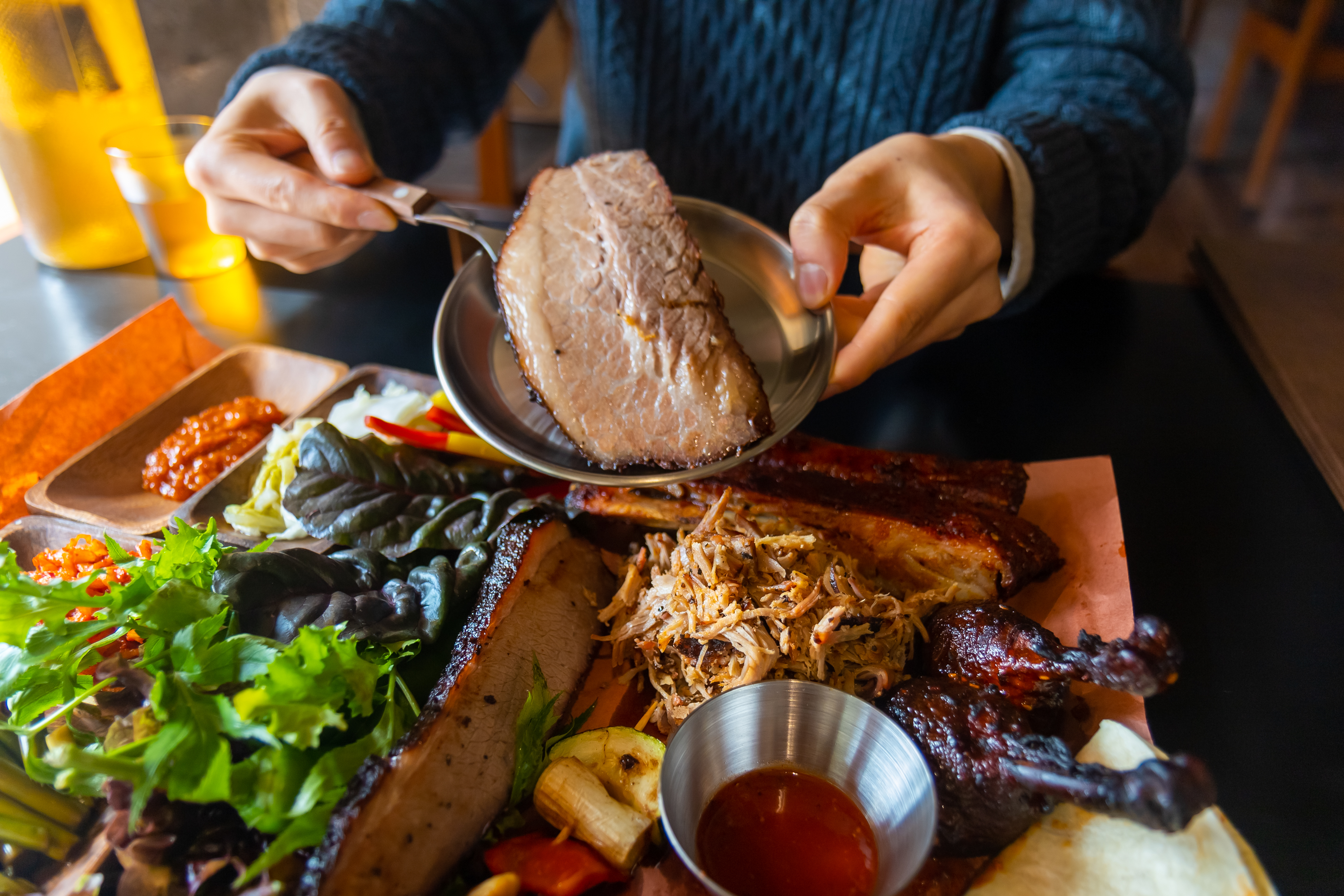 훈연향을 풍기며 등장한 '695 플래터'! 브리스킷, 스페어립, 폴드포크, 치킨롤리팝으로 이뤄져 있으며 아주 먹음직스러웠는데요. 고기를 숙성하고 훈제해 깊은 풍미를 느낄 수 있고, 식감이 질기지 않고 부드러워서 계속 먹게 되는 매직~ 또 하나 팁을 드리자면 상추 대신 또띠아(토르티야)에 쌈을 싸 먹으면 더 맛있게 즐길 수 있답니다! 플래터 한편에는 한국적인 밑반찬이 나오는데요. 이것 또한 고기와 같이 먹으면 별미예요. 920 플래터를 주문할 경우, 비프립을 직접 썰어주는 퍼포먼스도 구경할 수 있다니 입과 눈이 동시에 즐거운 식사가 될 것 같네요!
