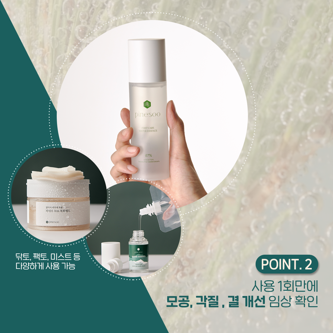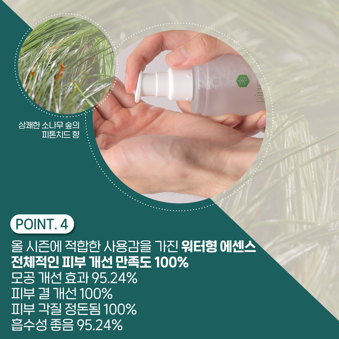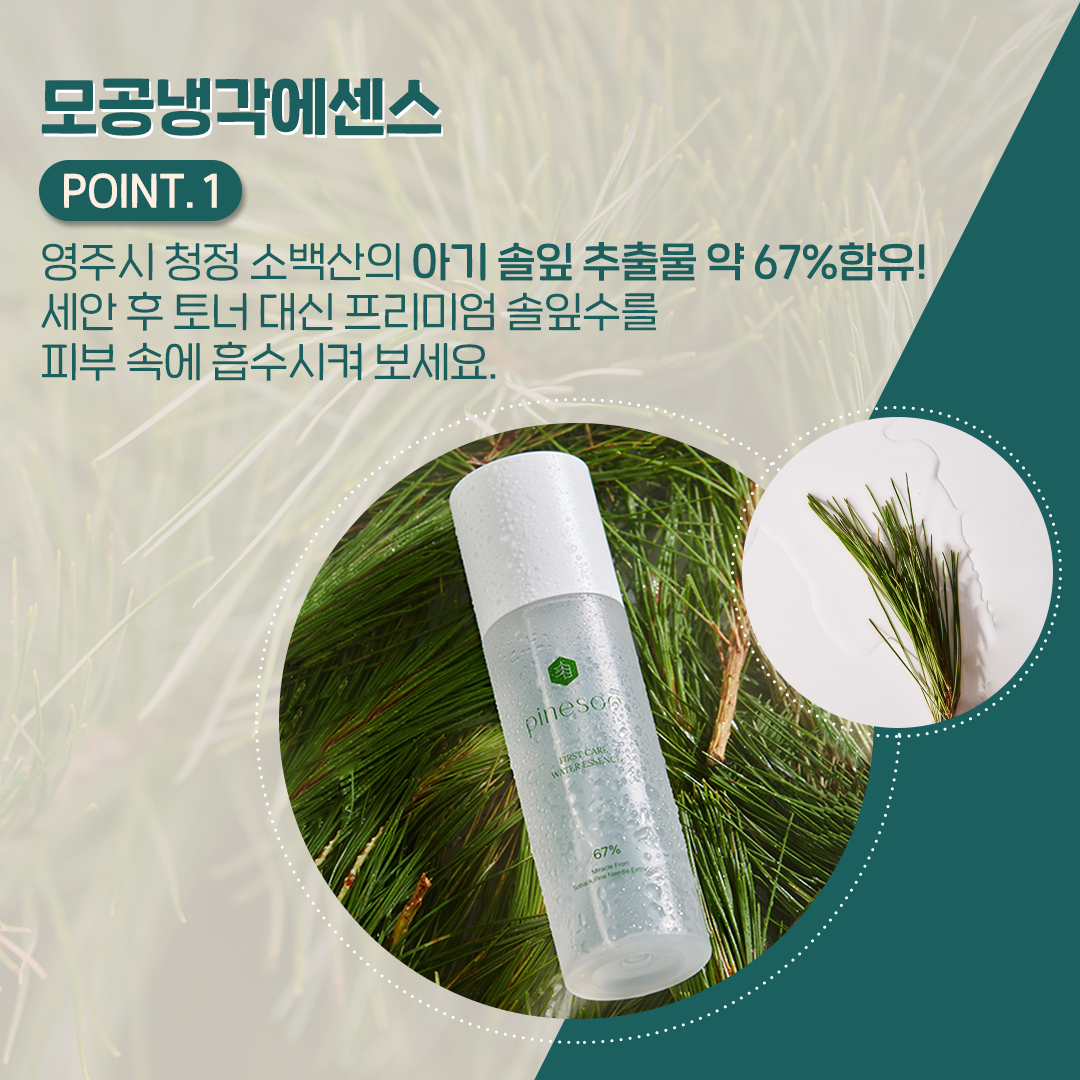 👉 모공냉각에센스 특징은? ✅ 영주시 청정 소백산의 아기 솔잎 추출물 약 67% 함유 ✅ 사용 1회 만에 모공, 각질, 결 개선 임상 확인 ✅ 닦토, 팩토, 미스트 등으로 다양하게 사용 가능! ✅ 피지 조절 특허성분, 아데노신, 나이아신아마이드 등의 유효성분 배합 ✅ 세안 후 첫 단계에 사용하는 워터형 에센스 (올 시즌에 적합한 사용감)