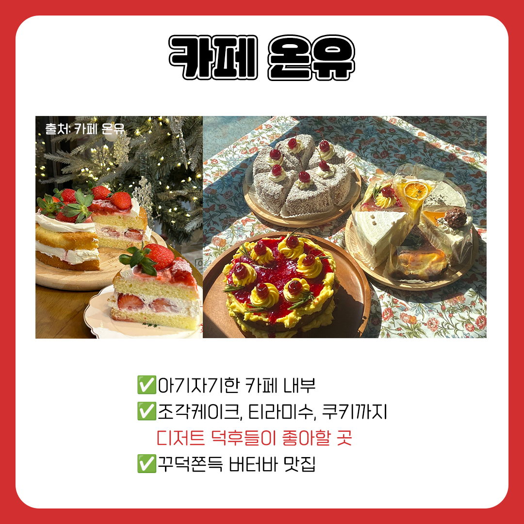 - 메뉴 : 버터바, 보틀 티라미수, 조각 모둠 케이크, 수제 쿠키, 크리푸딩 등
