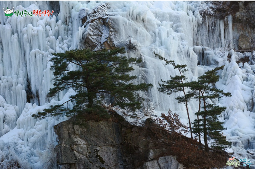 영주호 바로 옆에서는 꽁꽁 얼어있는 인공 얼음 폭포, 용혈리 폭포를 마주할 수 있습니다. 겨울의 차가움을 그대로 머금고 얼어버린 듯한 폭포의 모습이 신비롭지 않나요? 영주호 구경도 하고, 용혈폭포도 구경하며 겨울을 느껴보시길 바랍니다.
