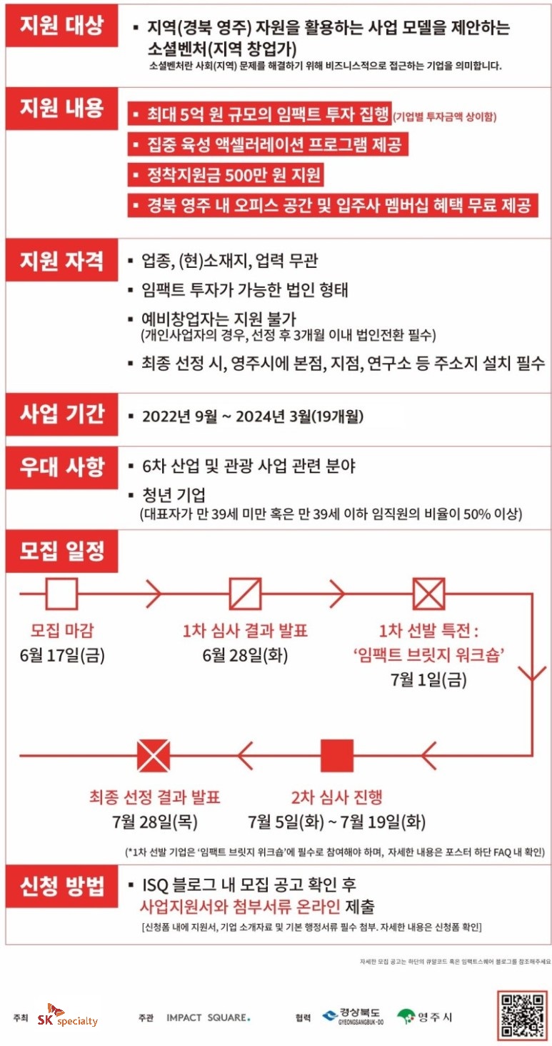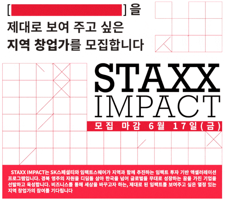 <STAXX IMPACT> 참여 기업 모집!(~6/17) 2022.06.08 11:47 STAXX Page 1. [모집 공고문 다운로드] STAXX IMPACT 모집 공고문.pdf 0.28MB [사업 지원서 다운로드] [기업명] STAXX IMPACT 사업 지원서.docx 0.31MB 사업 지원서 작성 시 유의사항 • 파일명은 '[기업명] STAXX IMPACT 사업지원서' 준수 (*기업명 외 자체 수정 X)• 지원서 내 신청서, 붙임서류 등 별도 파일 분할 없이 전체 내용을 기재하여 Word 파일 원본으로 제출 [사업 신청 폼] STAXX IMPACT 사업 신청폼(~6/17) 데이터 수집을 Typeform을 사용하는 환경으로 변환합니다. 아름 다운 온라인 양식, 설문조사, 퀴즈 등을 만들 수 있습니다. 무료로 사용해보십시오. form.typeform.com [자주 묻는 질문] <STAXX IMPACT> FAQ [ 모집 대상 ] 관련 FAQ impactsquare.notion.site 공유하기 게시글 관리 STAXX 블로그 'STAXX Page 1.' 카테고리의 다른 글 지속가능한 동네를 꿈꾸다! 도시재생의 사례 (1) 2022.07.27 지역 창업가들이 경북 영주에 모인 이유, 임팩트 브릿지 (2) 2022.07.13 왜 지금 소셜임팩트인가요? 사회를 변화시키는 영향력에 대하여 (1) 2022.06.30 [Q&A 인터뷰] STAXX IMPACT는 어떻게 운영될까? (1) 2022.06.29 변화를 만드는 지역 창업가 육성 프로젝트, STAXX에 대해 알아야 할 5가지 (1) 2022.06.23 댓글 공유하기 다른 글 댓글 이 글 공유하기 구독하기 구독하기 카카오톡 카카오톡 라인 라인 트위터 트위터 Facebook Facebook 카카오스토리 카카오스토리 밴드 밴드 네이버 블로그 네이버 블로그 Pocket Pocket Evernote Evernote 다른 글 지역 창업가들이 경북 영주에 모인 이유, 임팩트 브릿지 지역 창업가들이 경북 영주에 모인 이유, 임팩트 브릿지 2022.07.13 왜 지금 소셜임팩트인가요? 사회를 변화시키는 영향력에 대하여 왜 지금 소셜임팩트인가요? 사회를 변화시키는 영향력에 대하여 2022.06.30 [Q&A 인터뷰] STAXX IMPACT는 어떻게 운영될까? [Q&A 인터뷰] STAXX IMPACT는 어떻게 운영될까? 2022.06.29 변화를 만드는 지역 창업가 육성 프로젝트, STAXX에 대해 알아야 할 5가지 변화를 만드는 지역 창업가 육성 프로젝트, STAXX에 대해 알아야 할 5가지 2022.06.23 다른 글 더 둘러보기