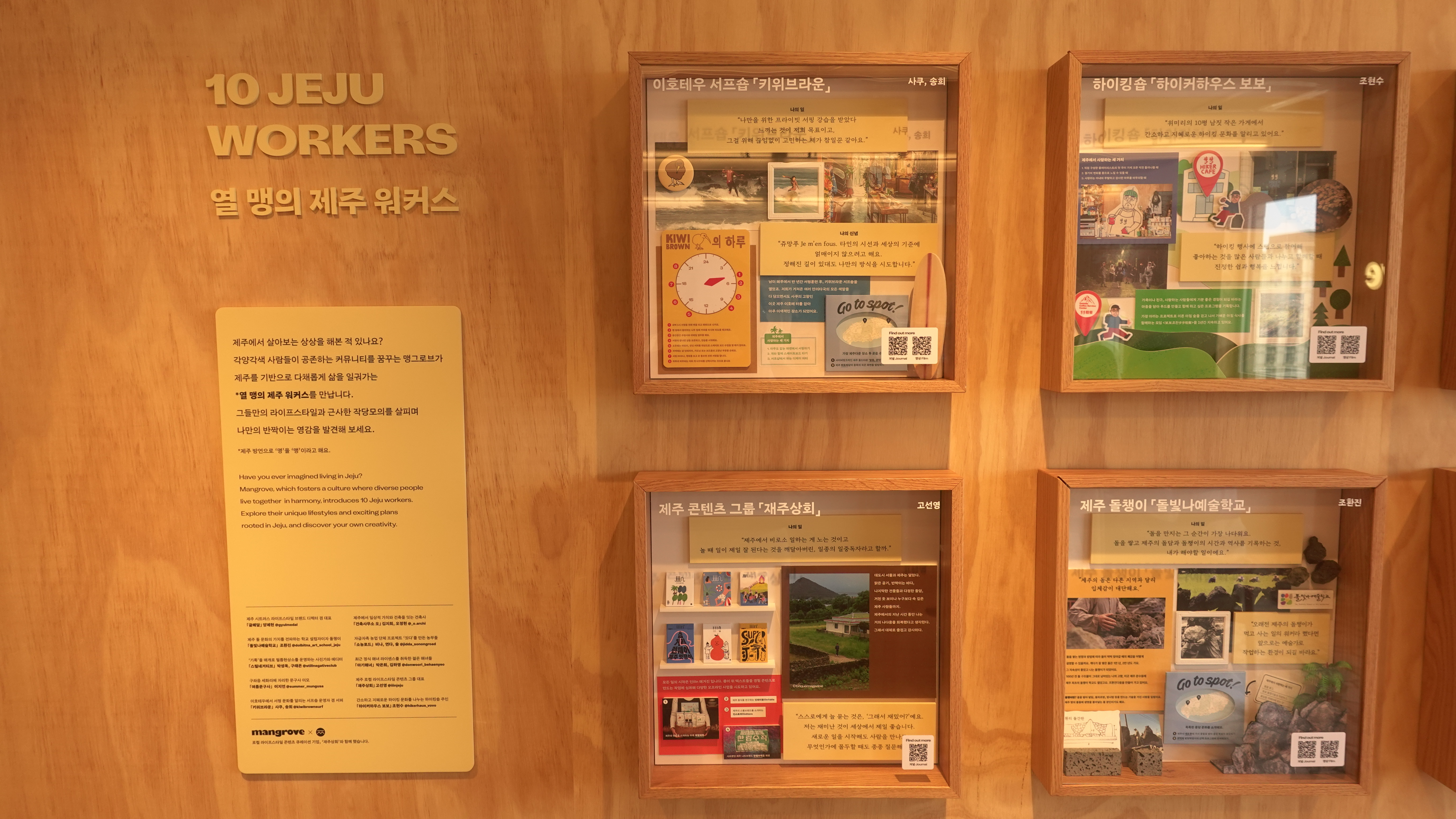 어마어마한 바람을 뚫고 숙소로 돌아왔더니 힘이 쭉 빠져 일을 하긴 어려울 것 같았습니다. 괜히 침대에도 다시 누워보고, 멍하니 창 밖도 쳐다보다가, 이대로 있기엔 아쉬워 맹그로브의 이곳저곳을 살펴보기 시작했습니다. 로비에는 ‘열 맹의 제주 워커스’라는 이름으로, 제주를 기반으로 다양한 삶을 살아가는 열 명의 이야기가 전시되어 있었어요.