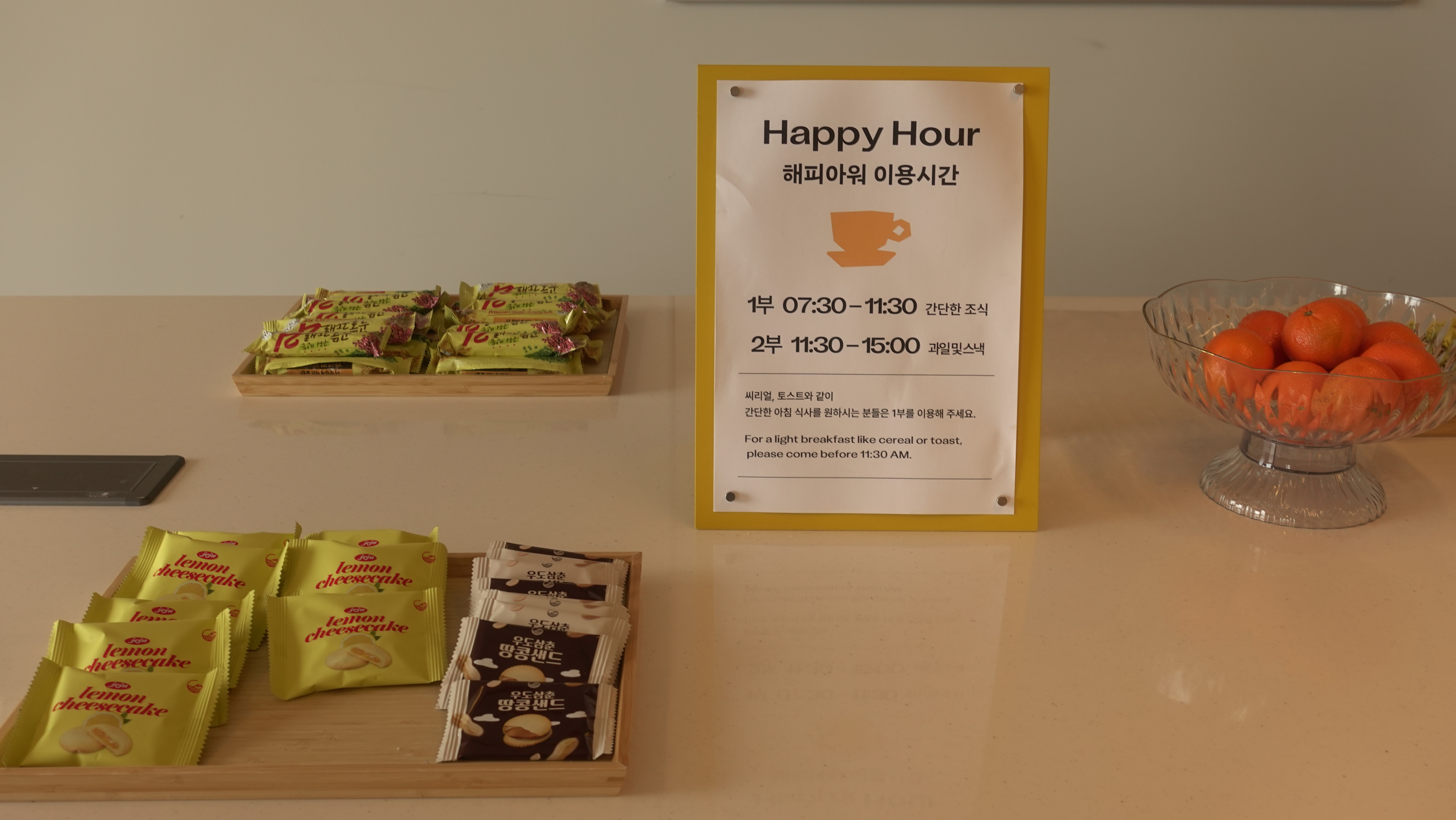 밀린 잠을 푹 자고 일어나, 공용 식당에서 간단히 아침 식사를 했습니다. 제주 하면 생각나는 귤은 물론이고, 제주에서만 볼 수 있는 과자들도 있어서 소소한 즐거움을 더해주었어요.
