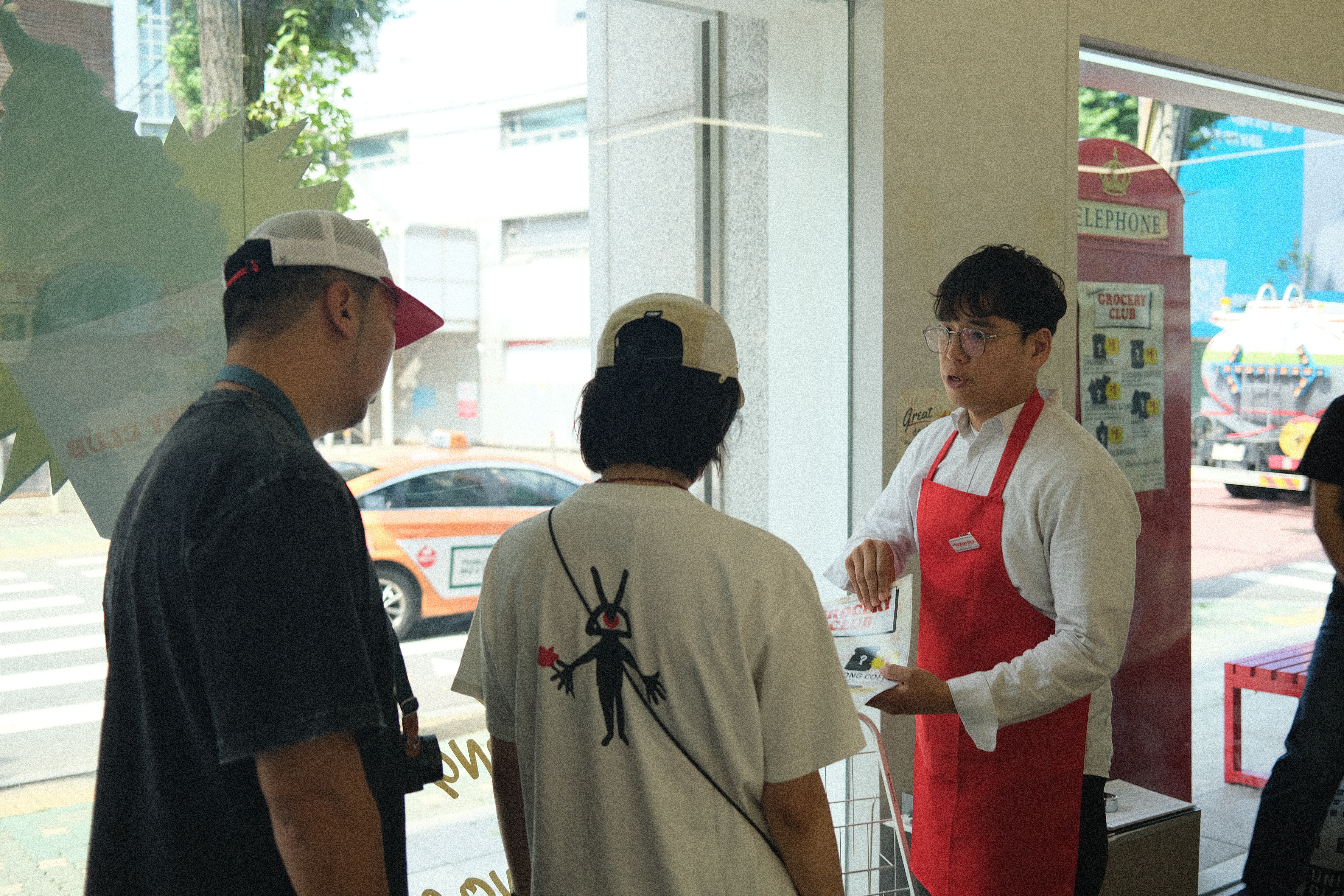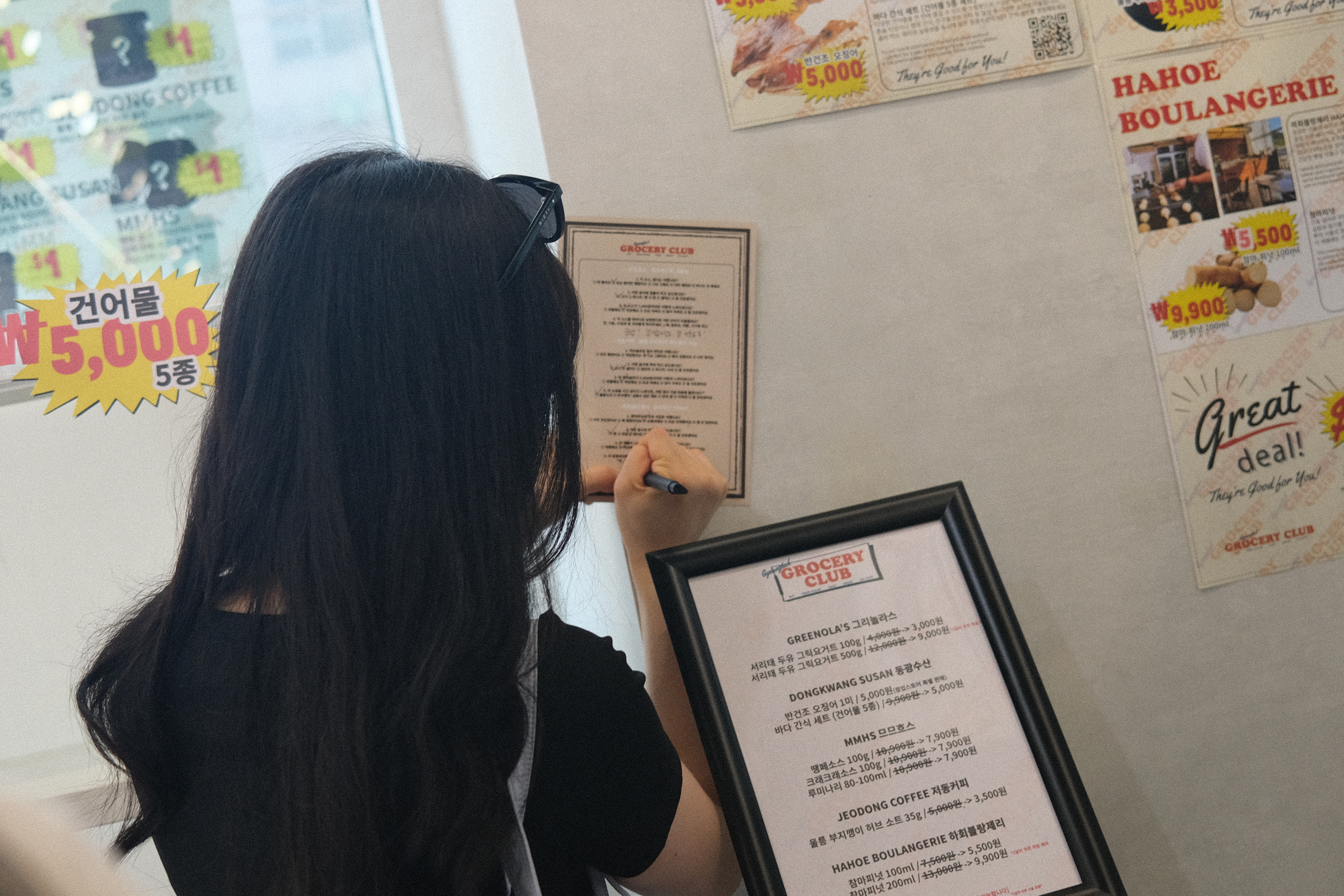 작성한 설문지를 들고 카운터 앞에서 제출을 기다리는데, 왼쪽에 있는 까만 아이스크림 사진이 눈에 띈다. “인스타그램 이벤트 참여하시면 기안장에서 BTS 진과 기안84가 먹었던 울릉도 먹물 아이스크림을 무료로 드려요~”라는 점원의 말에 바로 인스타그램에 접속해 팝업스토어 안쪽에서 찍은 거울샷을 스토리로 올린다. 그 댓가로 받은 오징어 먹물 아이스크림은 정말 ‘까만’ 아이스크림이었다. 무슨 맛이 날지 궁금했는데 신기하게도 초코 맛이 나는 시원한 아이스크림을 입에 물고는 설문지를 카운터에 제출한다. 캐셔가 설문지를 살펴보더니 작성해주셔서 감사하다며 기업의 제품 한 가지를 1달러, 즉 1,000원에 구매 가능한 작은 쿠폰을 준다. 쿠폰을 가지고 다시 진열대 쪽으로 다가가 가장 맛있었던 제품을 하나 집어든다. 계산을 위해 다시 카운터에 가려는데, 또 다른 제품이 발걸음을 붙잡는다. 아까 먹어봤을 때 이것도 참 맛있었는데… 두 제품을 손에 든 채 고민하다 에잇- 두 개 다 사야지! 결심하고 카운터에 가져간다. 제품 두 개의 가격은 총 4,000원. 이 가격에 두 개…? 심지어 여기서 얻은 수익금은 경북에 기부된다는 점이 신선한 충격으로 다가왔다. 그렇게 계산을 마치고 남은 아이스크림을 싹싹 긁어 먹으며 팝업스토어에서 퇴장한다.