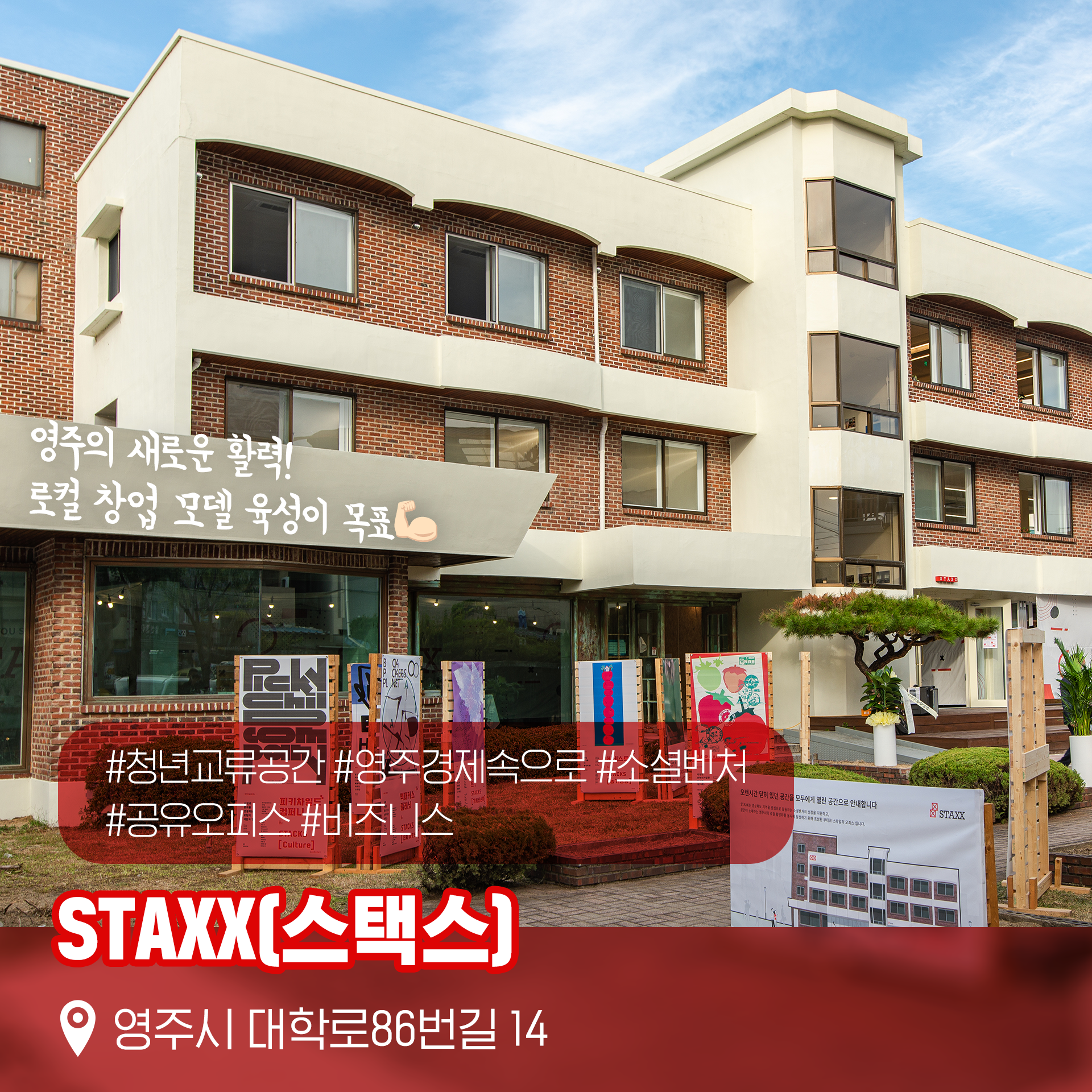 영주시의 창업 요람이 될 STAXX는 지난 9월에 오픈했는데요. 지역의 경제 활성화를 목표로 소셜벤처들의 성장과 공유오피스 공간을 지원하고 있어요. 특히 3층 라운지는 지역 커뮤니티 교류 공간으로 누구나 자유롭게 방문할 수 있어요. 로컬 관련 인사이트를 얻을 수 있는 책도 구비되어 있습니다. STAXX에서 진행하는 이벤트와 프로그램에도 참여할 수 있는데요. 누구든 자유롭게 휴식과 소규모 모임을 도모할 수 있는 공간이니 적극적으로 STAXX의 청년공간을 활용해 보세요. 단, 소규모 모임이나 대규모 행사를 진행할 경우 사전의 협의가 필요합니다. 라운지 이용 시간은 10:00~18:00까지 운영해요. *문의처: staxx@impactsquare.com