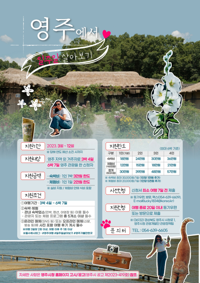 영주시가 ‘영주에서 일주일 살아보기’ 프로그램을 통해 체류형 관광을 활성화한다는 뉴스입니다. 관광객은 최소 3박에서 6박 동안 영주를 여행할 수 있는데요. 이용 조건으로는 영주 지역 숙박업소에 머물러야 하며 관광지 및 체험 프로그램을 5곳 이상 이용해 개인 SNS에 해시태그와 함께 여행 후기를 포스팅해야 합니다. 지원 금액은 1인 기준으로 1박당 3만 원이며, 체험비는 1일에 2만 원(식비 포함)입니다. 1인 추가 시마다 숙박비와 체험비가 각각 1만 원, 5천 원씩 추가 지원됩니다. 따뜻한 봄날에 맞춰 영주를 여행할 계획이라면 영주시 블로그를 참고해주세요~