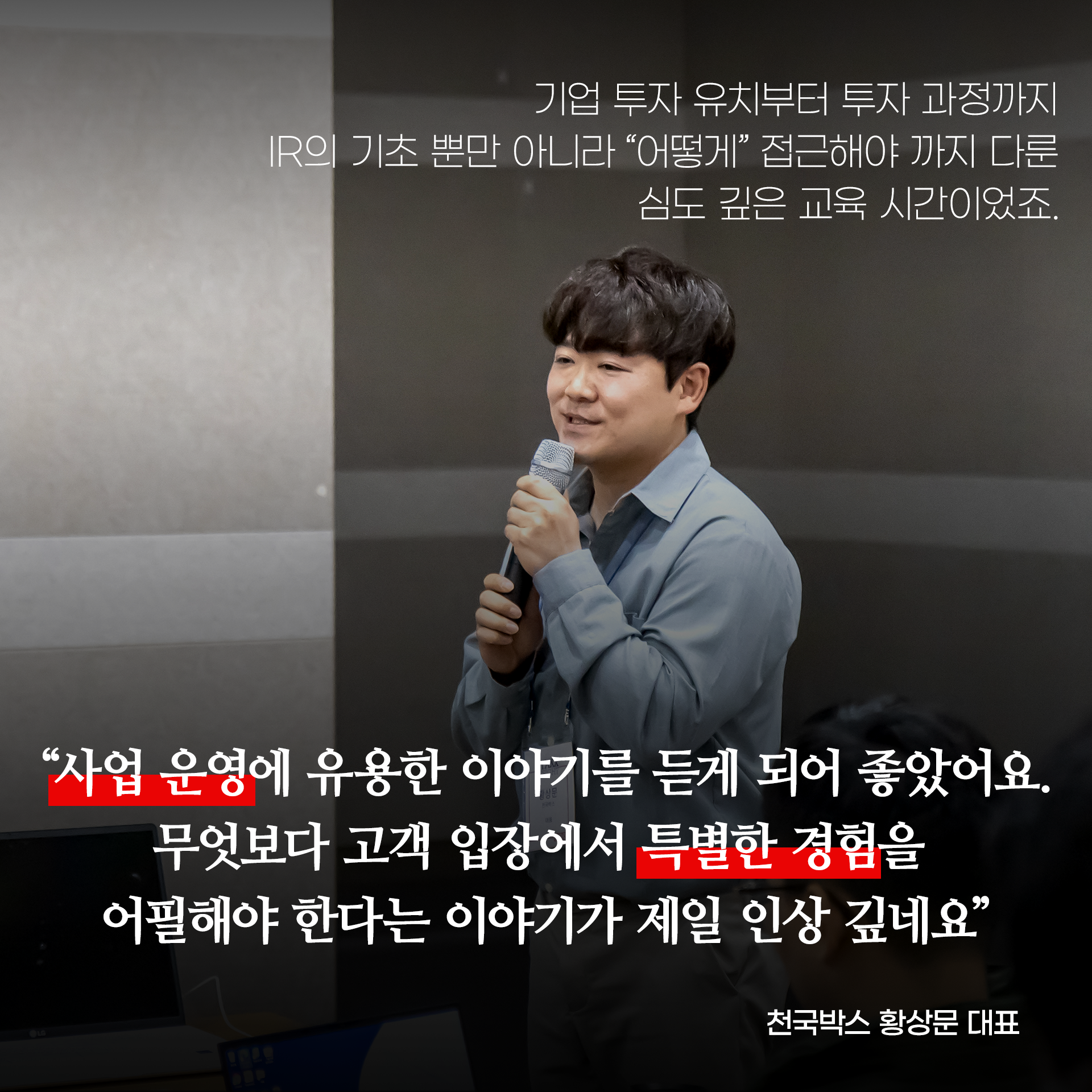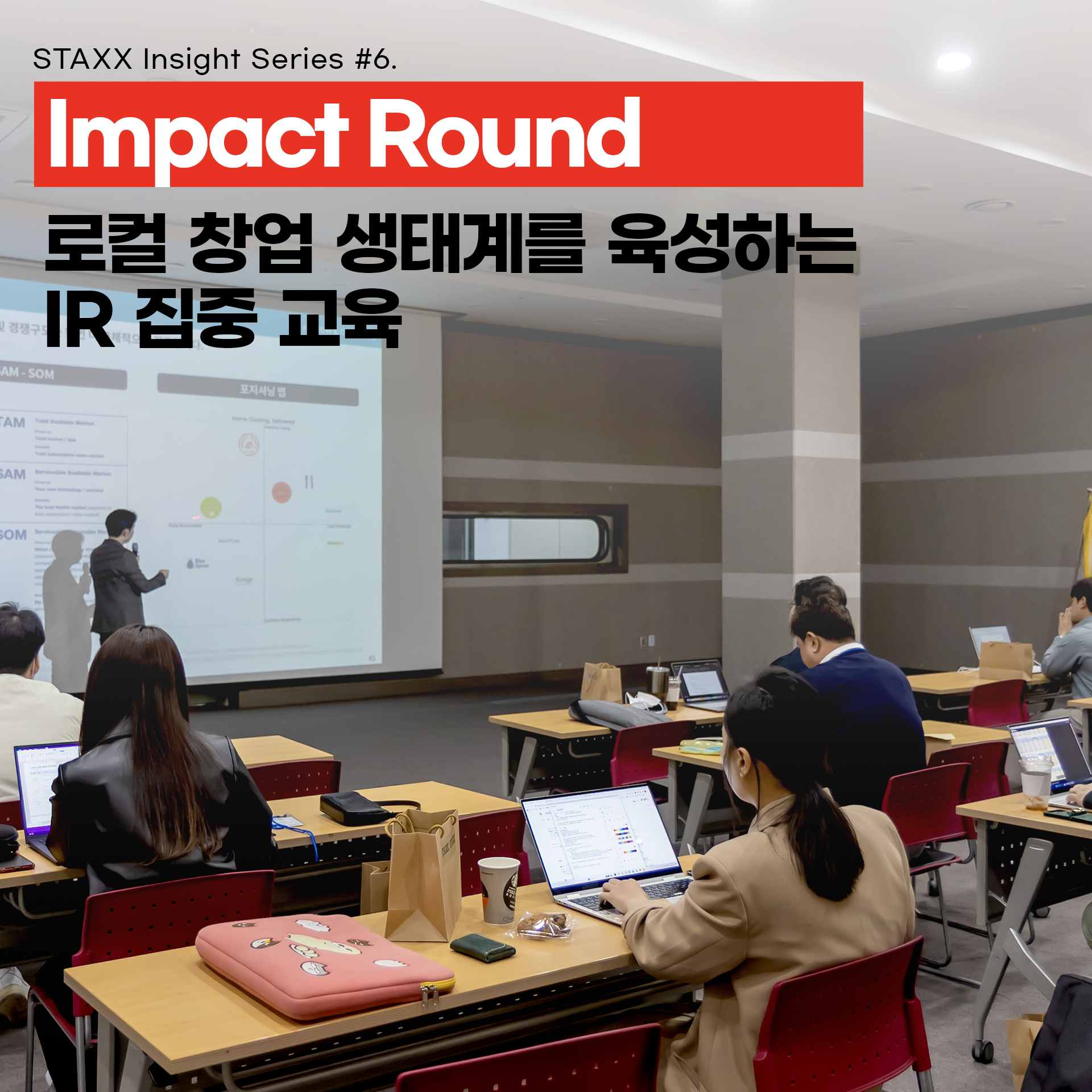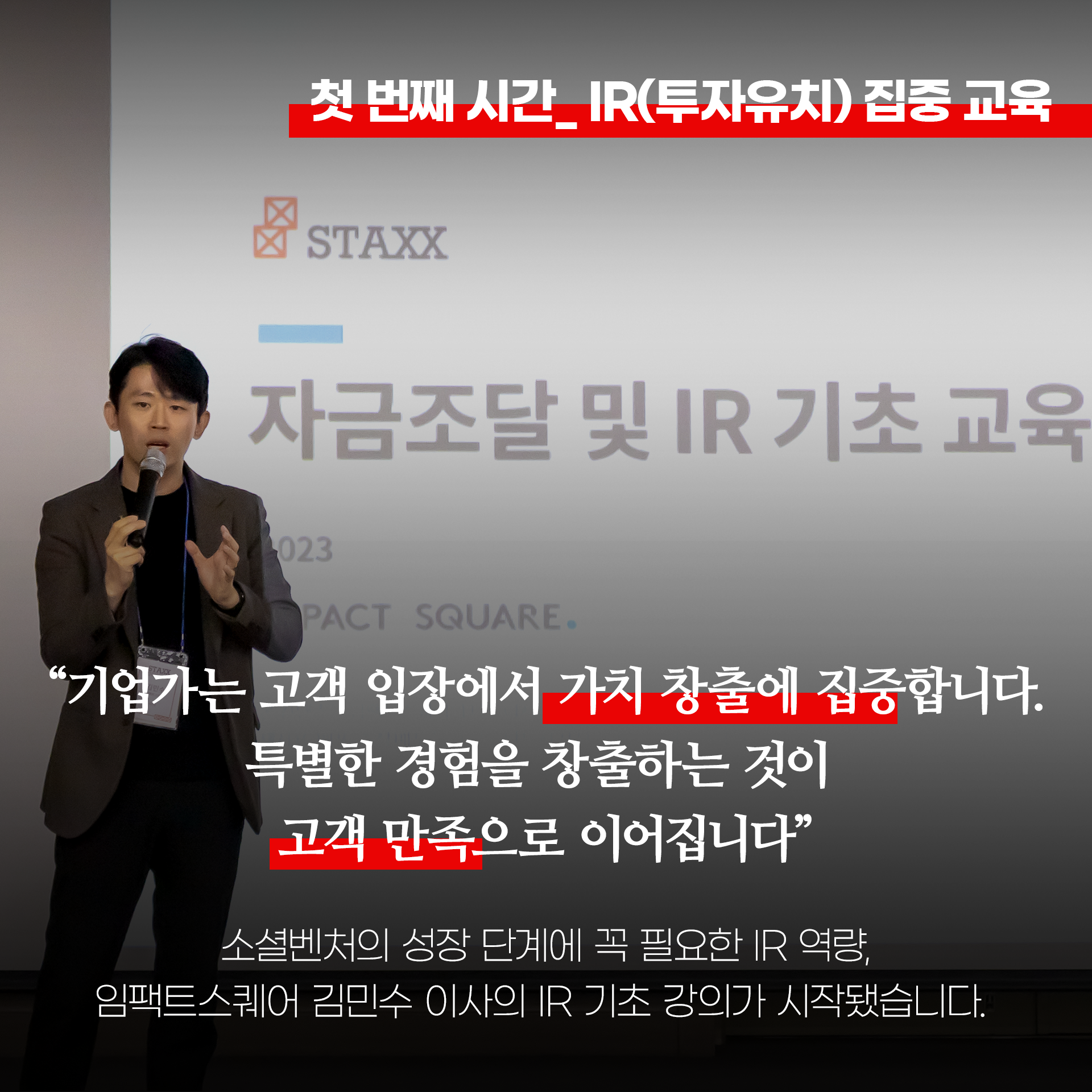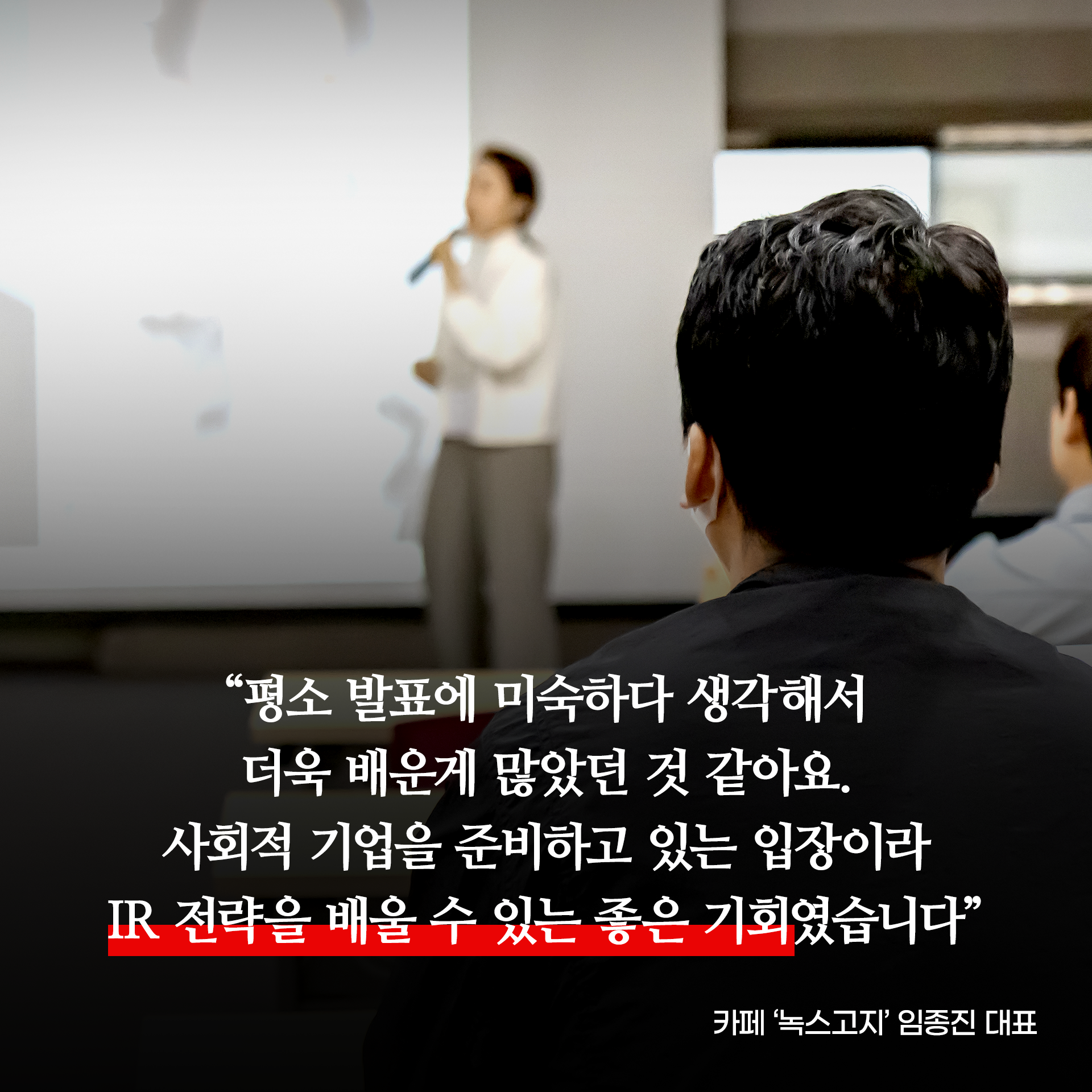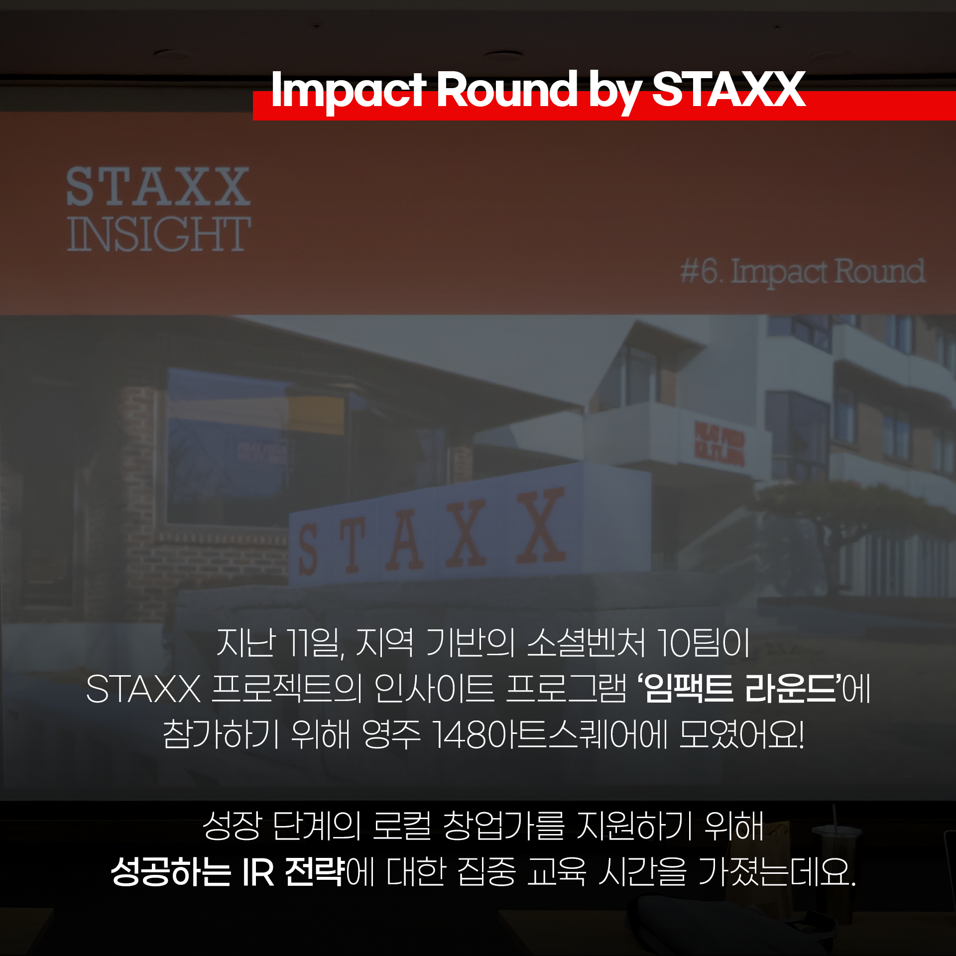IR 집중 교육 시간, STAXX 임팩트 라운드 현장 속으로! 2023.04.18 11:02 Archive./소셜미디어 아카이브 지난 11일, STAXX 프로젝트의 인사이트 프로그램, 임팩트 라운드를 참가하기 위해 경북 영주에 지역 기반10개사 소셜벤처가 모였어요!🧑🏻💻소셜벤처로서 사회적 가치를 확인하고구체적인 IR(Investor Relations, 투자 유치) 전략을 배울 수 있었던 시간, 지금 그 현장을 소개합니다.👀STAXX에서 준비한 여섯 번째 INSIGHT,아래 블로그에서 자세히 확인해보세요 로컬창업생태계를 육성하는 IR 집중 교육, STAXX 임팩트 라운드 “사회문제를 해결하는 사회적 가치가 비즈니스 경쟁력이 될 수 있도록” 지난 4월 11일, 경북 영주에 지역 기반 10개 소셜벤처가 모였습니다. STAXX 프로젝트의 인사이트 프로그램 '임팩트 라운드 staxx.tistory.com 가치를 쌓아 변화를 만듭니다.STAXX, the Impact Stack. 공유하기 게시글 관리 STAXX 블로그 저작자표시 비영리 변경금지 (새창열림) 'Archive. > 소셜미디어 아카이브' 카테고리의 다른 글 [STAXX 인터뷰 요약] 피키차일드컴퍼니 성주현 대표 - 로컬 문화의 부흥을 꿈꾸다 (0) 2023.04.25 STAXX PICK! #엘그라운드 편 (0) 2023.04.21 STAXX PICK! #피노젠 편 (1) 2023.04.11 기분이 저기압일 땐 고기앞으로! 미트필드로 GOGO! (1) 2023.03.31 영쥴랭 가이드 영주 봄나들이 스팟 추천 편 : 경북 영주로 봄나들이 떠나보세요🌸 (0) 2023.03.28 댓글 공유하기 다른 글 댓글 이 글 공유하기 구독하기 구독하기 카카오톡 카카오톡 라인 라인 트위터 트위터 Facebook Facebook 카카오스토리 카카오스토리 밴드 밴드 네이버 블로그 네이버 블로그 Pocket Pocket Evernote Evernote 다른 글 [STAXX 인터뷰 요약] 피키차일드컴퍼니 성주현 대표 - 로컬 문화의 부흥을 꿈꾸다 [STAXX 인터뷰 요약] 피키차일드컴퍼니 성주현 대표 - 로컬 문화의 부흥을 꿈꾸다 2023.04.25 STAXX PICK! #엘그라운드 편 STAXX PICK! #엘그라운드 편 2023.04.21 STAXX PICK! #피노젠 편 STAXX PICK! #피노젠 편 2023.04.11 기분이 저기압일 땐 고기앞으로! 미트필드로 GOGO! 기분이 저기압일 땐 고기앞으로! 미트필드로 GOGO! 2023.03.31 다른 글 더 둘러보기