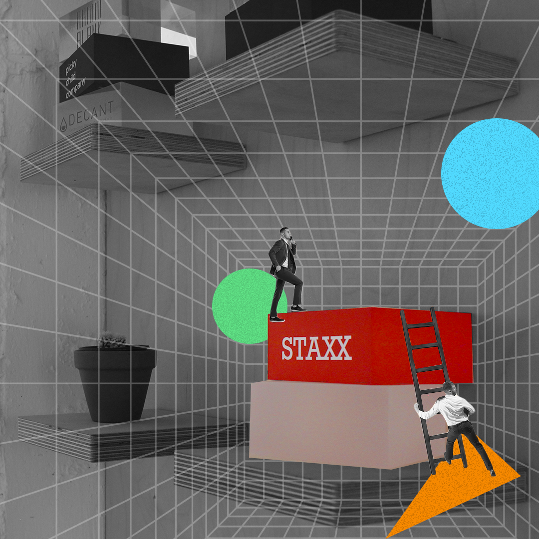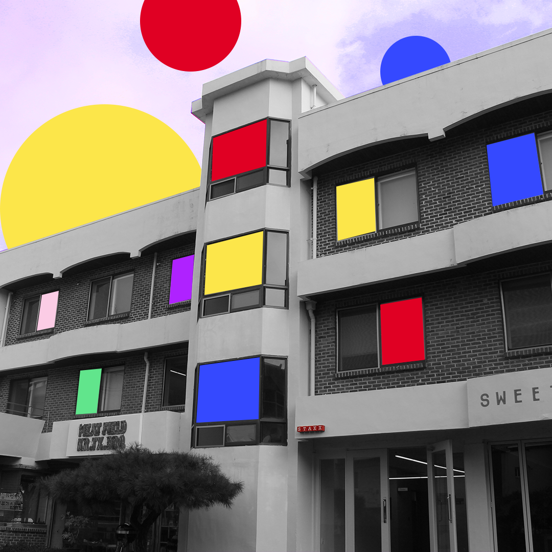 STAXX 건물 사진에 여러 색깔과 도형을 덧입혀